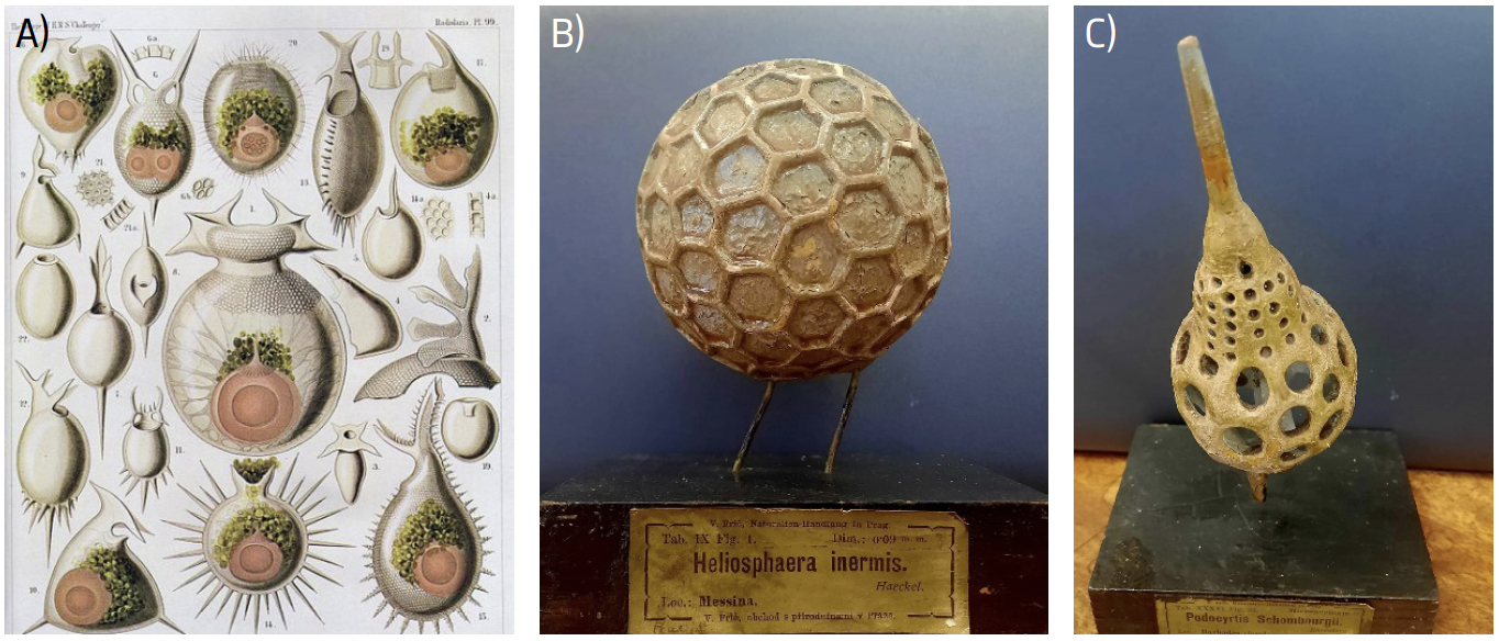 Os radiolários são protozoários ameboides unicelulares que produzem esqueletos minerais, geralmente de sílica, formando vasas siliciosas no fundo marinho. Estes esqueletos são frequentemente incorporados em rochas sedimentares. A designação foi dada por E. Haeckel, em 1862, ao observar a estrutura característica dos radiolários, com numerosos pseudópodes finos em forma radial. Os radiolários possuem uma cápsula central esférica, perfurada e constituída por quitina, que divide a célula em endoplasma e exoplasma. O esqueleto é formado por espículas de sílica ou sulfato de estrôncio. O citoplasma contém vacúolos com óleo, que auxiliam na flutuação e servem como reserva nutricional15. As suas formações esqueléticas variam em complexidade, sendo um critério importante para a sua classificação (FIGURA 11).