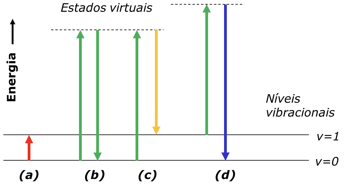 A diferença entre a espectroscopia de difusão de Raman e a espectroscopia de absorção no infravermelho resulta das diferenças nos processos físicos que governam a interação entre a radiação e a matéria. Tal como ilustrado na FIGURA 1 A), a espectroscopia no infravermelho mede diretamente a diferença de energia entre níveis vibracionais: para que ocorra absorção, a energia da radiação incidente tem de coincidir exatamente com a diferença de energia entre o nível vibracional fundamental e o nível excitado (identificados como v=0 e v=1 na FIGURA 1).