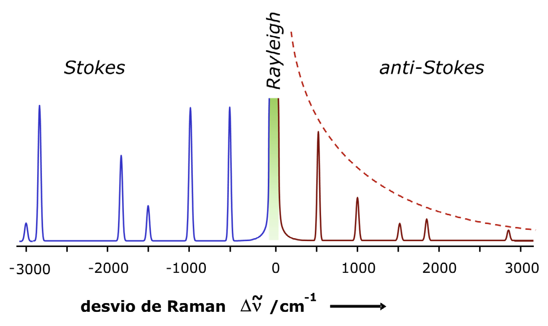 Quando os fotões difundidos têm menor energia do que os incidentes, os desvios observados são negativos e correspondem aos desvios de Stokes, ou região de Stokes (FIGURA 1 C)). Os desvios de anti-Stokes (FIGURA 1 D)) correspondem a valores positivos de ν − ν0, uma vez que o nível inicial é v=1 ou superior. Normalmente, o espectro de Raman é registado apenas na região de Stokes, pois a região anti-Stokes contém a mesma informação sobre os níveis de energia, mas apresenta menor sensibilidade: a intensidade das transições anti-Stokes diminui exponencialmente com o aumento de \( \nu -\nu_0\), devido à menor população dos estados vibracionais excitados v=1 (FIGURA 2).