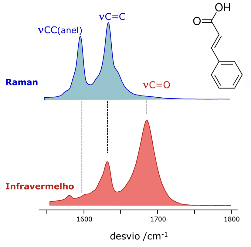 A FIGURA 3 ilustra este comportamento ao comparar os espectros de infravermelho e de Raman do ácido trans-cinâmico, um composto orgânico com ligações C=O e C=C duplas: no espectro de Raman, a banda mais intensa corresponde ao modo \(\nu\)(C=C), enquanto a banda \(\nu\)(C=O), dominante no espectro de infravermelho, é praticamente inexistente.