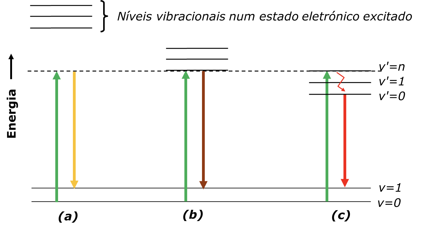 A frequência da fonte laser, \(\nu_0\), tem várias implicações práticas (por exemplo, tamanho do foco do feixe, profundidade de penetração na amostra, intensidade da luz difundida, entre outras), mas há uma que merece destaque: quando \(\nu_0\) é elevada, o estado virtual pode coincidir com um estado electrónico excitado da amostra, originando fluorescência (FIGURA 4 C)). O efeito Raman de ressonância, também representado, é um caso particular do efeito Raman que produz uma amplificação muito forte da difusão associado aos modos vibracionais ligados à alteração geométrica da molécula no estado electrónico excitado.