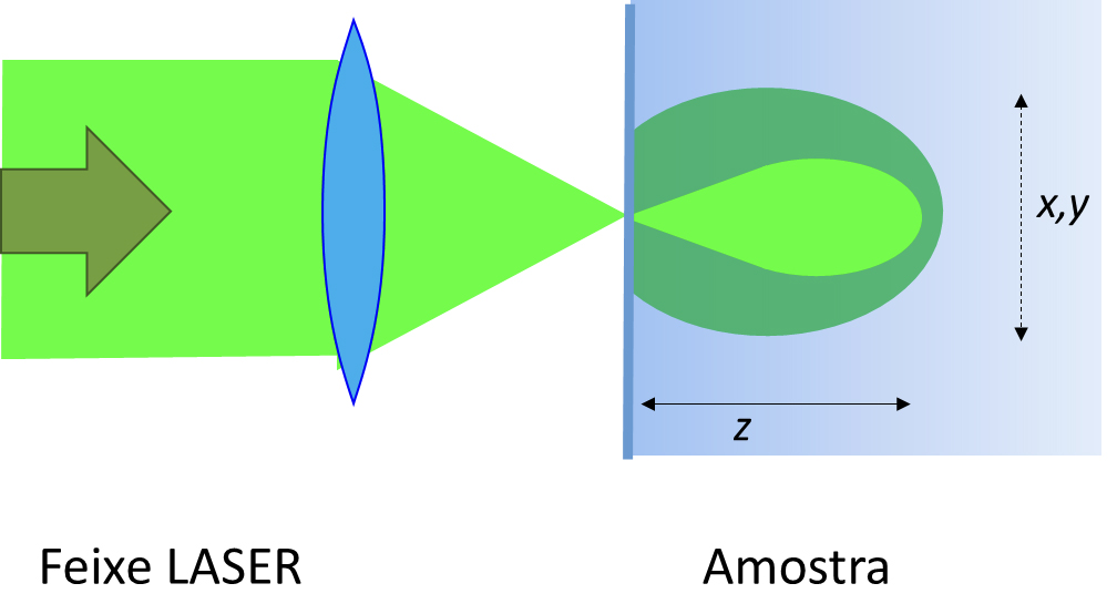 Isto define um volume focal do laser, que constitui uma estimativa mínima do volume analisado. A radiação laser também é difundida para fora do volume focal, originando difusão Raman nessas regiões, pelo que o volume efetivamente analisado é maior (FIGURA 7).