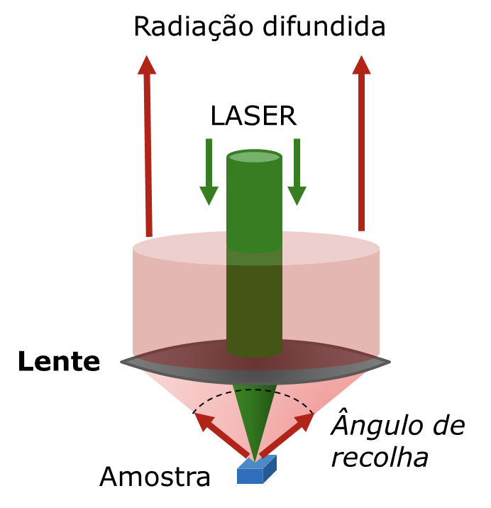 Estas possibilidades são amplamente exploradas na microscopia Raman e, de forma ainda mais eficaz, na microscopia Raman confocal. A utilização de um microscópio para focar o feixe na amostra e recolher o sinal Raman apresenta uma dupla vantagem: devido à grande abertura numérica (NA) das objectivas, o feixe laser é focado num ponto muito pequeno e a radiação difundida é recolhida num ângulo amplo (FIGURA 8). O aumento da irradiância local e a recolha em grande ângulo compensam a redução do volume de amostra analisado.