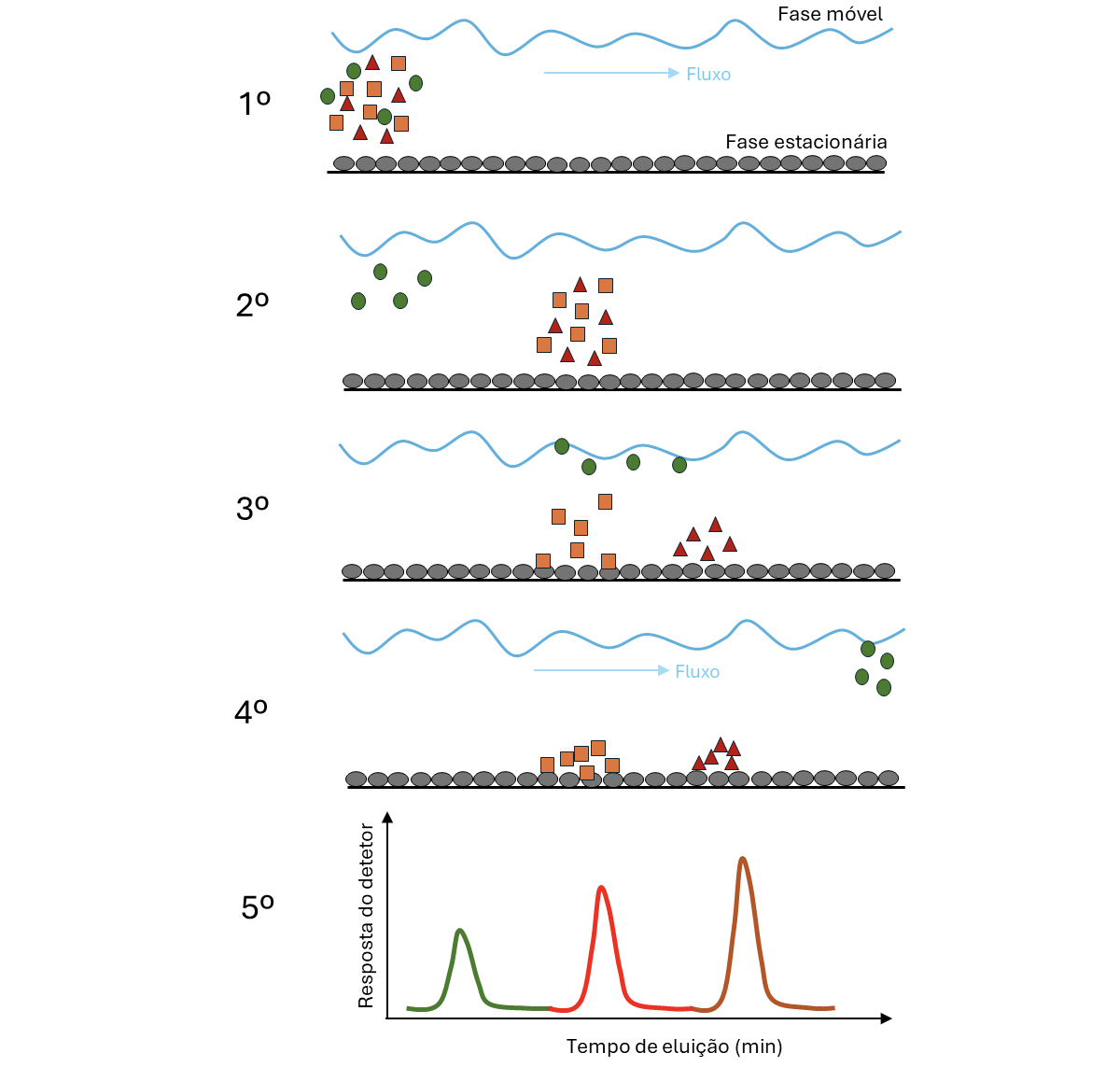 A FIGURA 1 representa o processo de forma simplificada: 1.º, a mistura é inserida no sistema; 2.º, a fase móvel transporta as moléculas que estabelecem um equilíbrio com a fase estacionária; 3.º e 4.º, sucessivas etapas de equilíbrio separam as moléculas consoante a sua afinidade; 5.º, o gráfico (cromatograma) mostra o sinal do detetor com a sequência de saída das moléculas.