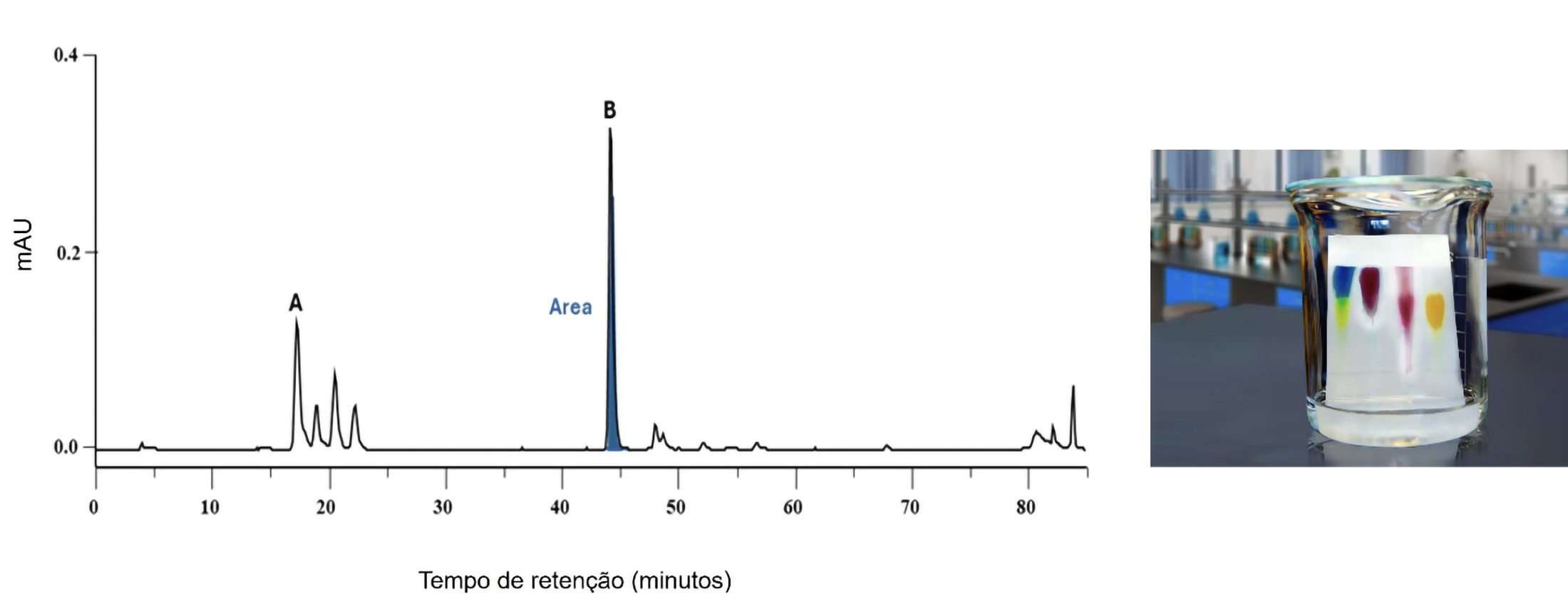 A FIGURA 4 apresenta um cromatograma feito em coluna, com picos bem separados e em destaque um pico com a área em azul para exemplificar. Também apresenta uma imagem de TLC, com manchas sobrepostas à esquerda, amarela e azul, e as arroxeadas - uma separada e outras que se arrastam com grande afinidade com a placa, e a última alaranjada com boa resolução.