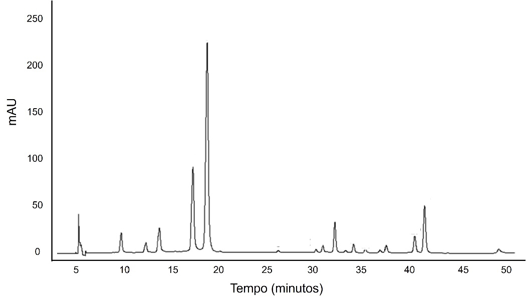 Estudos reais com vinhos da casta Aragonez utilizam a cromatografia gasosa (GC) para identificar picos de moléculas como a β-damascenona (aroma floral/frutado)8. Além disso, a técnica de HPLC permite identificar até 20 antocianinas diferentes9. Um cromatograma real de um vinho autêntico funciona como uma “impressão digital” (FIGURA 5); qualquer alteração nestes picos pode indicar a fraude por mistura com uvas de menor qualidade10.