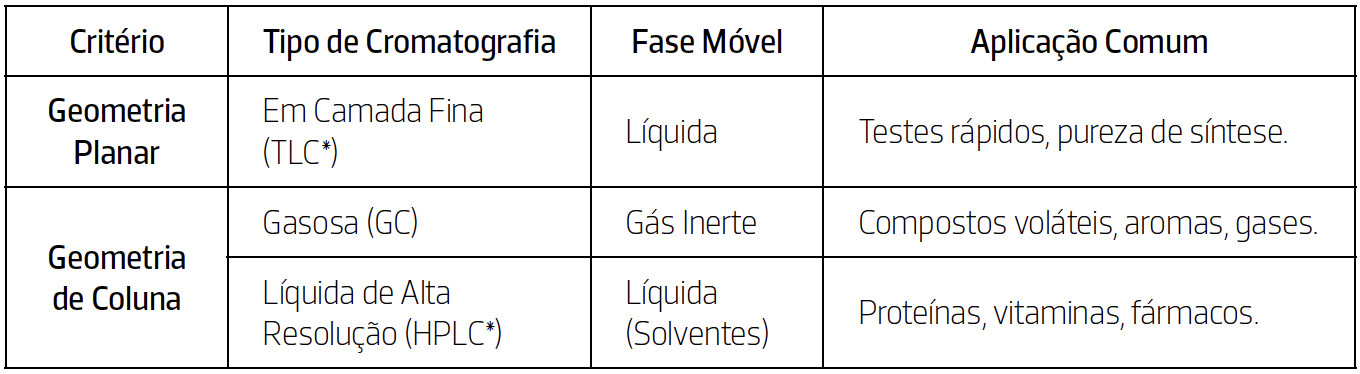 Cromatografia gasosa (GC, do inglês Gas Cromatography): usa gases inertes (ideal para substâncias voláteis).