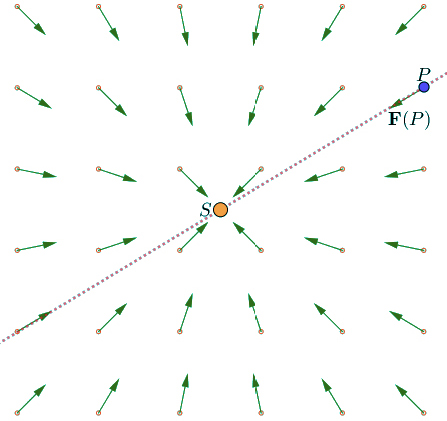 Para começar, suponhamos que temos um campo de forças central (ou radial) \(F\), isto é, em cada ponto \(P\) (o Planeta), \(F(P)\), a força aplicada numa partícula teste de massa 1, colocada em \(P\), tem a direção da reta que une \(P\) a um centro de forças fixo \(S\) (o Sol).