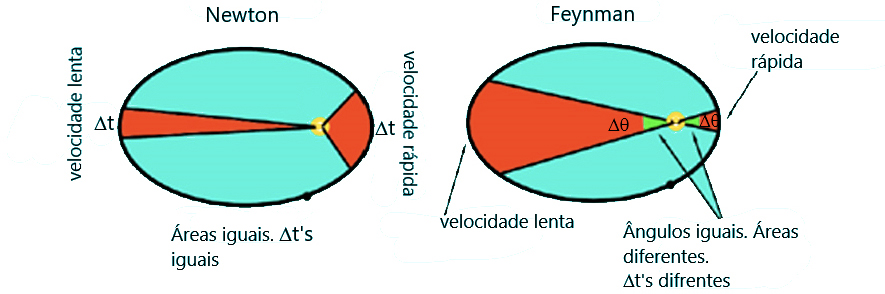 - Feynman: os ângulos centrais são todo os mesmos e portanto os \(\Delta t\)’s são diferentes. Os \(\Delta v\)’s apontam todos para o Sol e são todos iguais, em módulo, ao longo de toda a órbita.