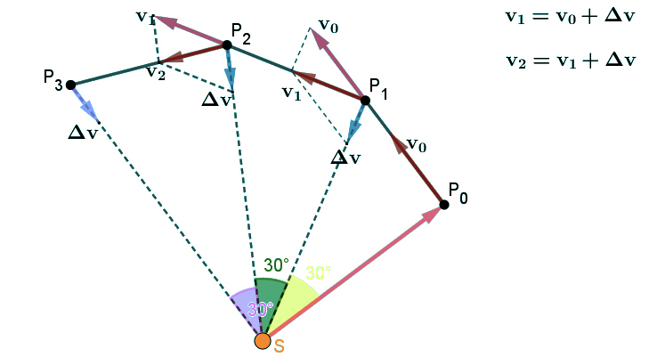 4. No ponto \(P_2\) o planeta sofre uma força impulsiva que muda a sua velocidade de \(\Delta v\) no sentido radial. A nova velocidade \(v_2\) é calculada pela regra do paralelogramo \(v_2=v_1+\Delta v\).