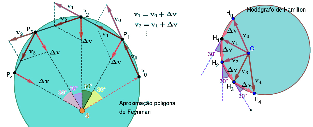 Por outro lado, Richard Feynman3 usa uma aproximação poligonal diferente: os vértices da poligonal, em vez de estarem separados por um mesmo intervalo de tempo \(\Delta t\), estão agora separados por um mesmo ângulo ao centro \(\Delta\theta\). Veja a FIGURA 3, onde se comparam as duas abordagens, respetivamente, de Newton e Feynman, e ainda a FIGURA 4.