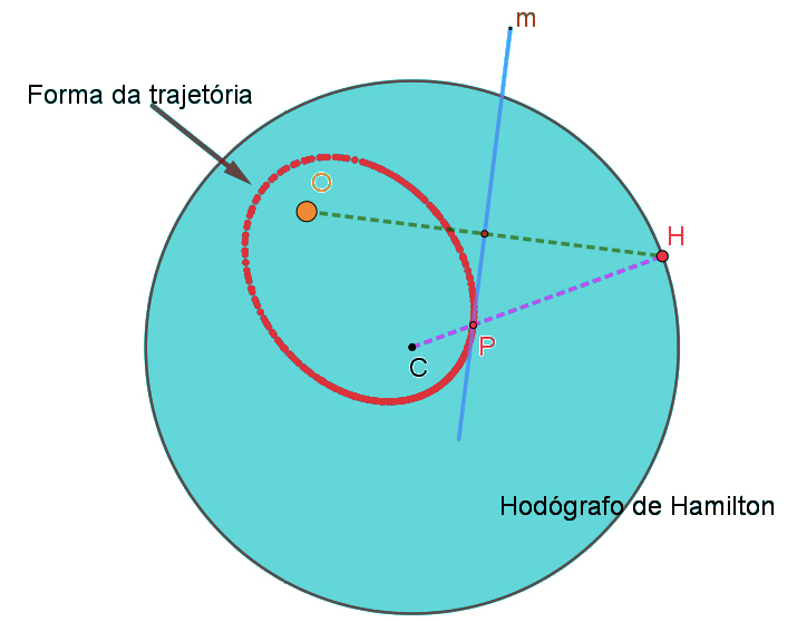 5. Quando \(H\) varia sobre o hodógrafo, \(P\) descreve uma elipse (ou uma hipérbole) cujos focos são \(O\) e \(C\). Além disso, a mediatriz \(m\) é tangente à elipse no ponto \(P\).