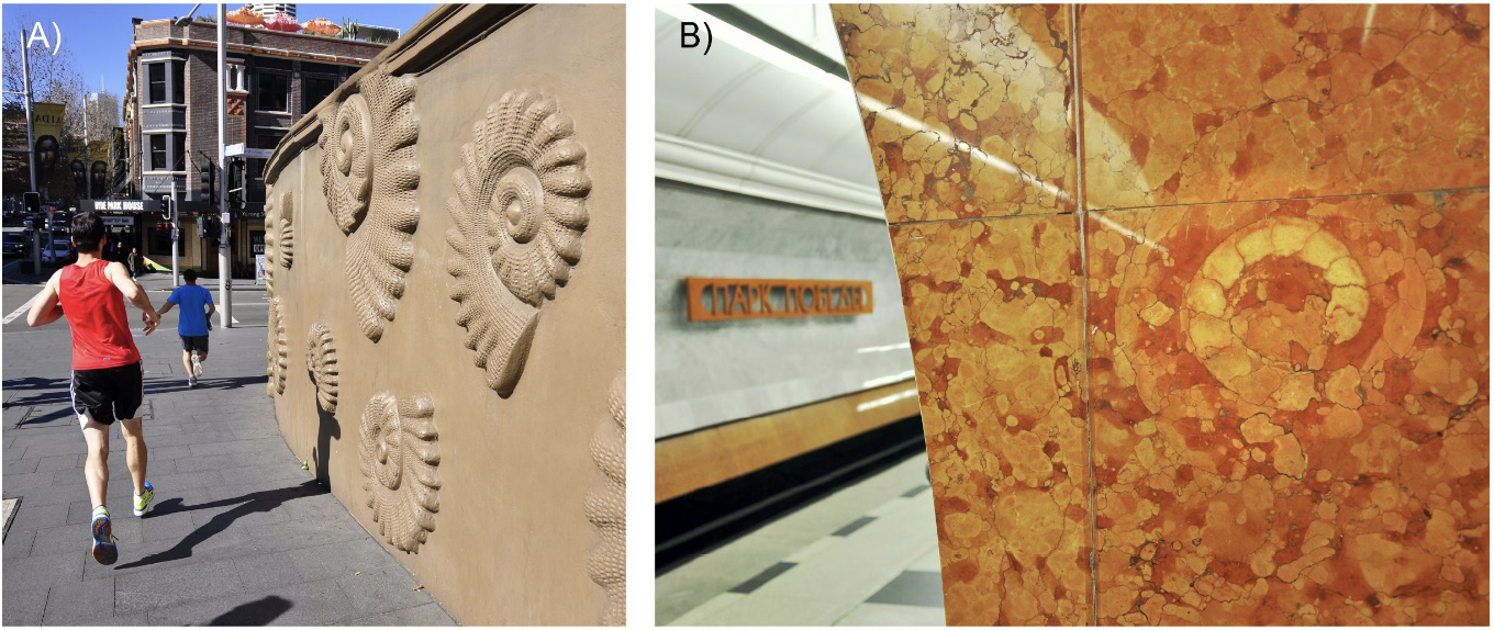 Daí que não seja incomum encontrar vestígios fossilizados destes seres preservados nos elementos da geodiversidade utilizados1 nas construções das nossas cidades, nas rochas ornamentais das fachadas e pavimentos dos edifícios. No caso das amonites, cefalópodes emblemáticos do Mesozoico, até os podemos ver como motivos artísticos, embelezando as paredes exteriores de museus (FIGURA 1 A)). Em Portugal, são menos comuns que os fósseis dos rudistas2, é um facto, mas estão lá! Basta – saber – procurá-los! Estão também nos pavimentos e nas paredes urbanas um pouco por todo o mundo (FIGURA 1 B)). Assim, o propósito deste segundo opúsculo do Breve Guia de Paleontologia Urbana é, precisamente, ajudar a reconhecê- los e a interpretá-los.