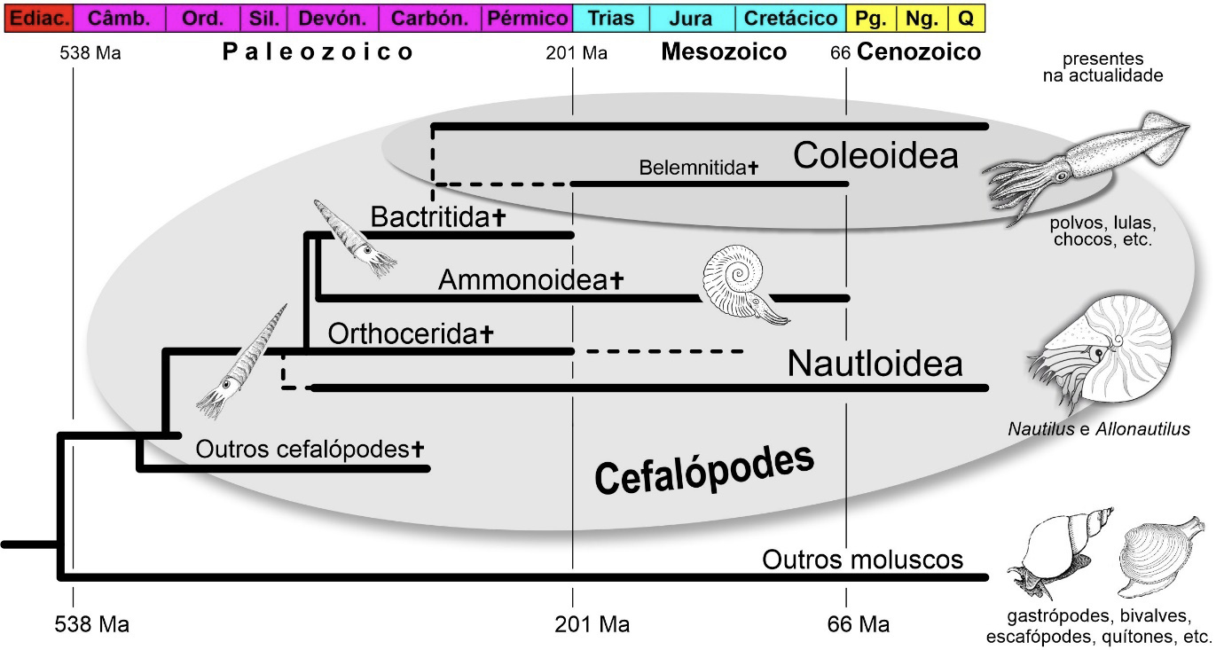 Olhando apenas para os cefalópodes da atualidade, para as lulas e os polvos deste final de Cenozoico, seria difícil imaginar quão mais diversificado este importante grupo de moluscos foi no passado. Seria uma tarefa igualmente desafiante entender a sua vasta representação no registo fóssil do Fanerozoico, em rochas com idades que variam entre os cerca de 538 e os 66 milhões de anos (Ma) de idade, do Câmbrico ao final do Cretácico, e qual a razão da sua extrema importância para a biostratigrafia, ou seja, para a datação das sequências de estratos de génese marinha do Paleozoico e do Mesozoico.