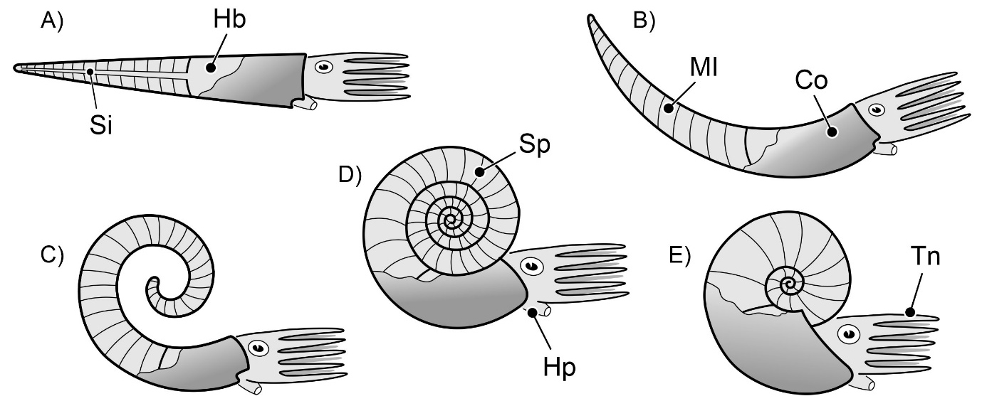 Se do Mesozoico à atualidade os nautiloides que predominaram tinham conchas externas tabicadas fortemente espiraladas, nautilicónicas, como em Nautilus, durante o Paleozoico a forma das conchas era bastante mais variada, raramente espiralada com espira apertada (FIGURA 3E). As mais comuns eram as ortocónicas, em forma de cone retilíneo (FIGURA 3A), como em Orthoceras, ou levemente arqueadas, cirtocónicas (FIGURA 3B).