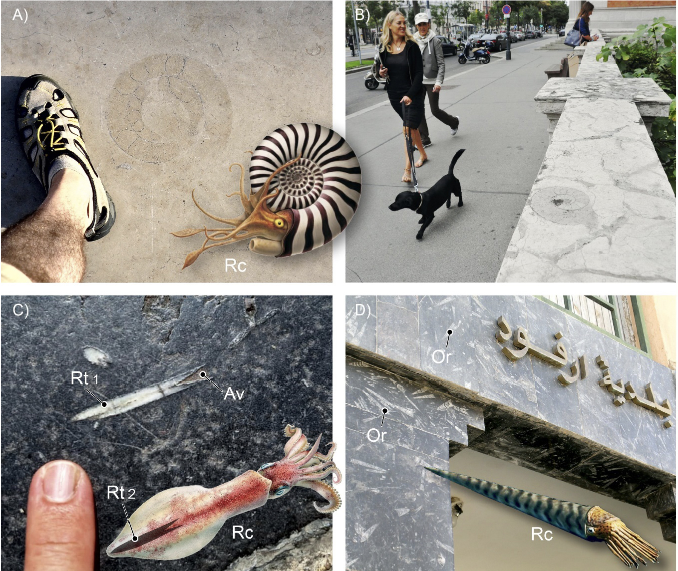 Como visto anteriormente, no caso dos fósseis de rudistas, alguns dos elementos de identificação dos seus fósseis estão patentes nas secções expostas em paredes e pavimentos urbanos1. Para os cefalópodes, contudo, os elementos de identificação dos diversos grupos, mesmo dos de categoria mais elevada, categoria Ordem, por exemplo, tais como Ceratitida, Ammonitida, etc., estão — na sua maioria — apenas patentes à superfície tridimensional dos moldes internos ou das mineralizações das conchas. Esses elementos diagnósticos não são visíveis em secções. Isto torna difícil — mas não completamente impossível — a identificação dos seus fósseis em fachadas e pisos. Tal como referido anteriormente1, é fundamental ter-se em conta que a identificação de fósseis em secção expostos em contexto urbano, não é uma ciência exata. Trata-se de uma abordagem expedita tendo em vista a divulgação científica e o usufruto dos fósseis que ocorrem na cidade, não de uma análise paleontológica convencional em condições laboratoriais ótimas. É a abordagem — e a identificação — possível, não a ideal.