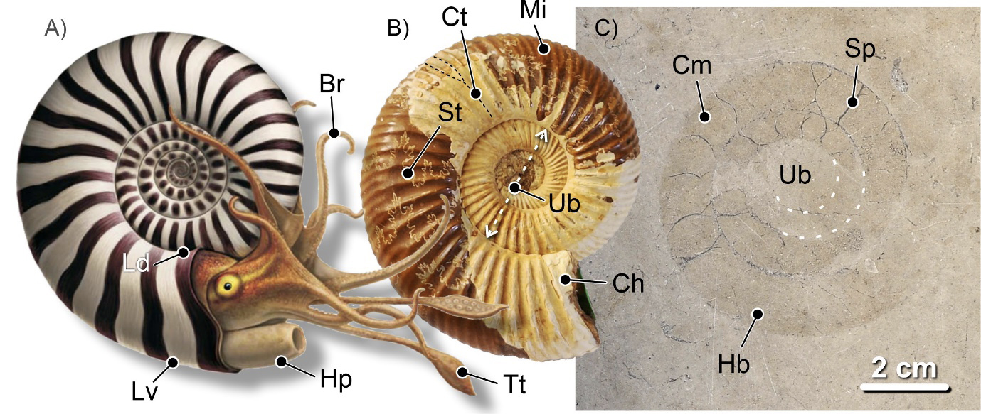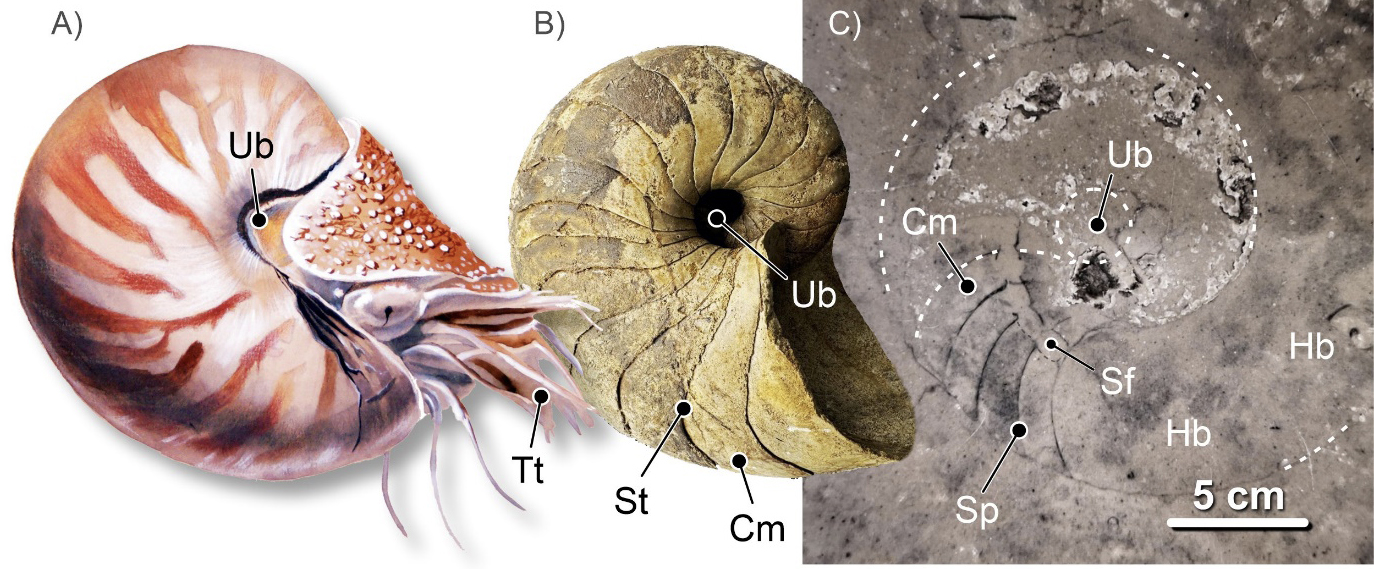Em ambos os grupos, os seus representantes desenvolveram conchas biomineralizadas externas, subdivididas internamente em câmaras, por meio de septos ou tabiques. Por isso se diz que o Nautilus da atualidade possui concha externa tabicada. A porção da concha que apresenta septos, da câmara inicial – no início do crescimento da concha do animal – até ao último septo, é denominada fragmocone (FIGURA 7). A última câmara, ocupada pela maior parte do corpo visceral do animal, é denominada câmara de habitação ou habitáculo. O animal controla o que se passa em todos os espaços interiores da concha. Nomeadamente, nas câmaras do fragmocone, por via de um elemento do seu corpo mole, o sifúnculo. É assim que o Nautilus regula a flutuabilidade do seu corpo na coluna de água, consoante – ao nadar – mergulha ou emerge. O sifúnculo estava alojado numa estrutura carbonatada da concha, por vezes muito complexa, no sifão. O sifúnculo, sendo de natureza orgânica, não se preserva nos fósseis. Mas o sifão, esse, está frequentemente bem patente (FIGURA 6C e 7C).