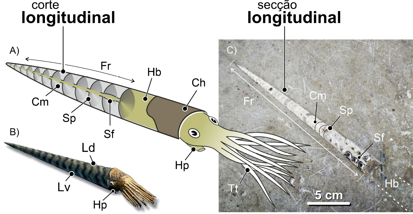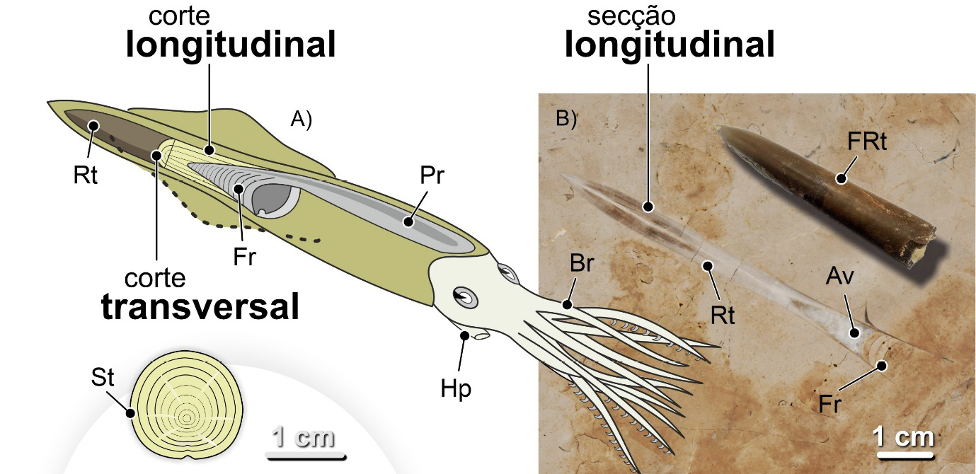 A concha interna das belemnites é normalmente dividida em três zonas ou elementos constituintes principais. Do extremo distal para o proximal, isto é, de trás para a frente do molusco: rosto, fragmocone e pro-óstraco (FIGURA 17). Estes elementos tinham composições mineralógicas e comportamentos mecânicos distintos. O rostro era maciço, constituído pelo mineral calcite, e bastante resistente. O fragmocone e o pró-óstraco, significativamente mais delicados. Além disso, eram constituídos por aragonite, um mineral que, apesar de ter a mesma constituição química da calcite, tem propriedades distintas. A aragonite biogénica, quando enterrada nas camadas mais superficiais da crosta terrestre após a morte dos organismos, é menos resistente quimicamente, mais solúvel, sendo mais facilmente eliminada. Assim, há muitos fósseis de rostros e muito poucos em que toda a concha tenha sido preservada.