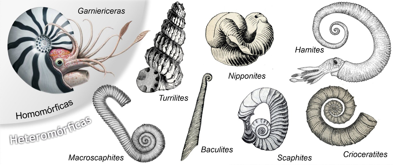 Ao inverso do que em tempos se supôs, a diversidade de formas das amonites heteromórficas cretácicas não reflete a degenerescência do grupo, prenúncio de extinção, por se afastarem do “ideal” homomórfico mais familiar. Pelo contrário, tal como para os rudistas2, revelam uma capacidade do grupo de se diversificar, de explorar novos habitates e novas maneiras de “estar na vida”.