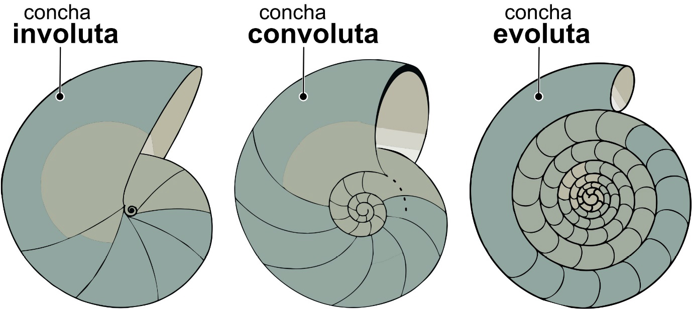 Os amonoides, ao longo dos seus 344 Ma de existência e de evolução, do Devónico até finais do Cretácico (FIGURA 2), desenvolveram conchas com formas muito variadas (FIGURA 10), bastante mais diversas que as dos nautiloides (FIGURA 3). Em termos gerais, dois tipos fundamentais de conchas de amonoides, ou melhor, de tipos de enrolamento da concha, são distinguidos: enrolamento homomórfico e heteromórfico. Quanto ao modo de enrolamento, entre as amonites homomórficas, destacamos conchas evolutas, convolutas e involutas (FIGURA 11). Há que ter em conta que estas são categorias criadas pelos humanos para lidar com a espantosa diversidade de formas de conchas de amonoides, para as catalogar e descrever. Não são categorias naturais estanques. Na natureza existe um continuum de formas, das conchas claramente involutas às tipicamente evolutas, passando pelas mais ou menos convolutas.