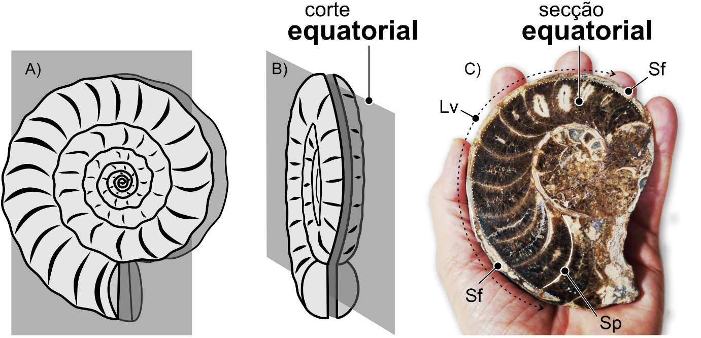 Os fósseis urbanos destes e doutros amonoides são expostos como resultado de cortes com orientações variadas. Como resultado, à semelhança do que sucede com as conchas de nautiloides nautilicónicos, obtemos três categorias principais de secções: equatoriais (= longitudinais), as mais fáceis de reconhecer, mostrando claramente o crescimento espiralado da concha, axiais (=transversais) e oblíquas. As secções equatoriais resultam de cortes orientados ao longo do máximo diâmetro da concha, perpendicularmente ao eixo de enrolamento (FIGURA 12). As secções axiais, de cortes orientados ao longo do eixo de enrolamento dos amonoides homomórficos. As oblíquas, segundo planos posicionados entre as axiais e as equatoriais segundo ângulos variados, não sendo paralelas nem às axiais, nem às equatoriais (FIGURA 13). Quando as secções não são coincidentes com o plano de máximo diâmetro da concha, dizem-se subequatoriais (FIGURA 14). Do mesmo modo, quando resultam de cortes paralelos ao eixo de enrolamento axial, não coincidindo com ele, dizem-se subaxiais (FIGURA 15).