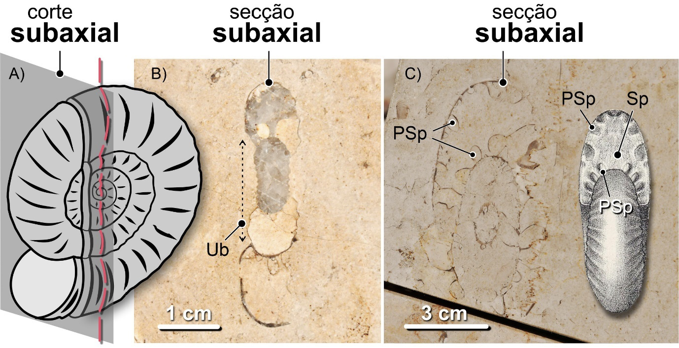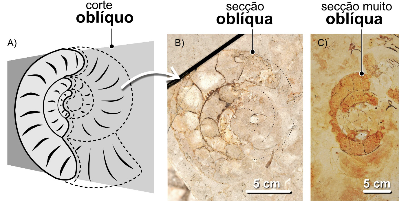 Uma vez que os fósseis de cefalópodes em contexto urbano surgem em secções bidimensionais expostas na superfície de fachadas e em pavimentos, para os identificar e interpretar adequadamente há que ter em conta a orientação dos cortes que as originaram, quer para os nautiloides (e.g., FIGURA 6), quer para os amonoides e as belemnites.