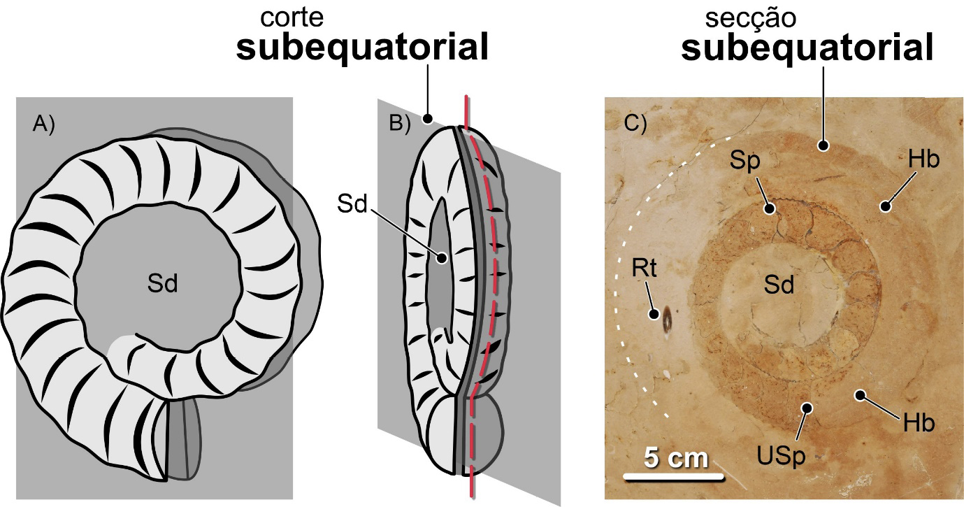 Para reconhecer fósseis de nautiloides em secção, em contexto urbano, os cortes mais adequados – aqueles que geram secções mais informativas – são os cortes longitudinais, no caso das conchas ortocónicas (FIGURA 7C) e os equatoriais (FIGURA 6C)), no caso das conchas nautilicónicas. Longitudinais, são os cortes que se desenvolvem ao longo do eixo de crescimento das conchas ortocónicas. Sabemos que um corte é longitudinal quando na secção resultante é visível o sifão ao longo de todo o seu comprimento. Se isto não suceder, as secções resultaram de cortes com orientações diferentes. De cortes sublongitudinais, se se desenvolveram ao longo da concha, mas não forem coincidentes com o sifão. Ou de oblíquos, quando resultam de cortes realizados segundo diferentes ângulos em relação ao eixo da concha.