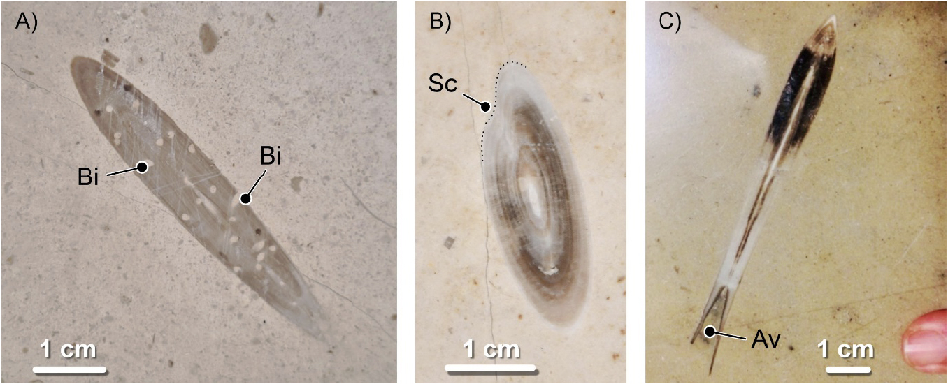 Sendo os rostros os elementos mais resistentes do esqueleto interno destes animais, serão estes que encontraremos mais frequentemente fossilizados. São sobretudo fáceis de reconhecer quando se apresentam sob a forma de secções longitudinais (FIGURA 17).
