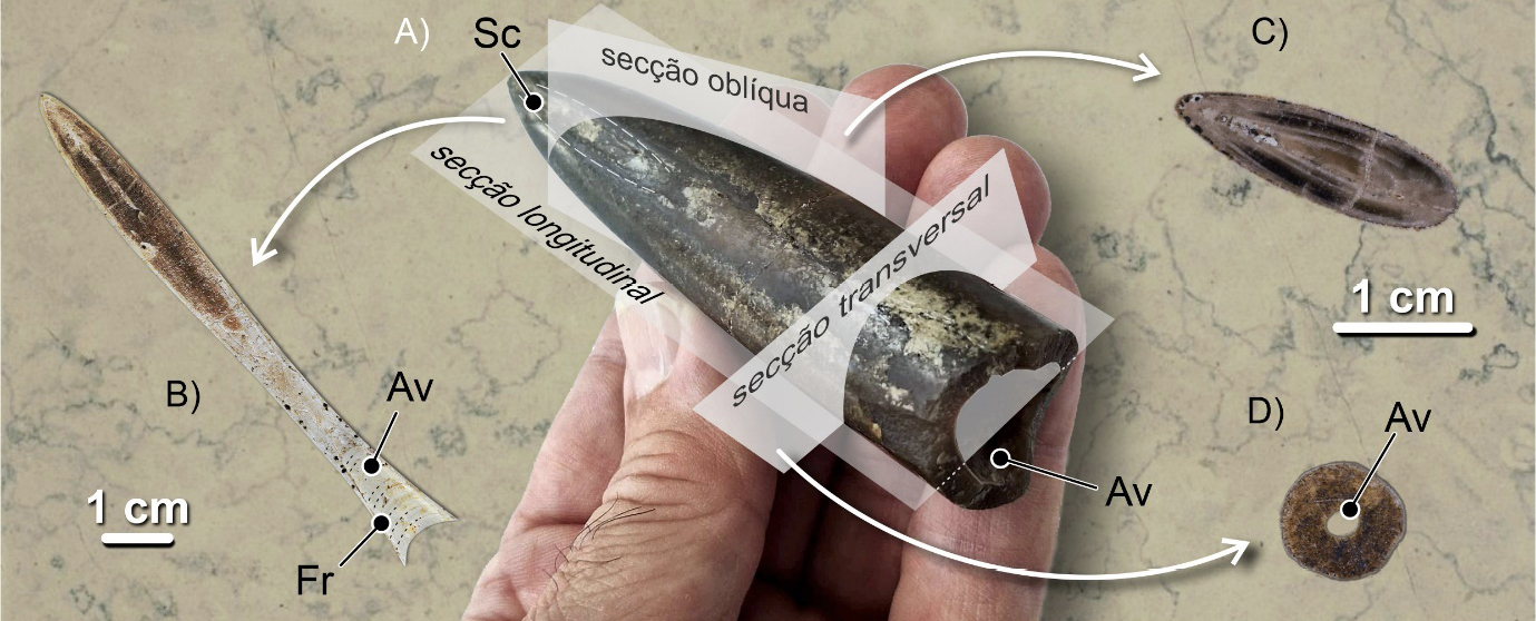 Os rostros apresentam dois padrões microstruturais: um concêntrico resultante dos anéis de crescimento dispostos homocentricamente em redor do eixo central do rostro e, sobreposto a este, um radial expressando o desenvolvimento fibroso dos cristais de calcite. O padrão concêntrico reflete o crescimento do rostro que, por sua vez, resulta do crescimento do organismo. Já o radial manifesta o desenvolvimento dos cristais de calcite que constituem o rostro. Acontece que, em contexto urbano, em fachadas e pavimentos, estando os fósseis polidos, apenas o padrão concêntrico é discernível, mais evidente em cortes transversais e oblíquos (FIGURA 18B). O extremo proximal do rostro é oco. A essa cavidade é dado o nome de alvéolo (FIGURA 18C e 19). O alvéolo alojava o fragmocone, muito reduzido, da concha do animal e pode ser visto em cortes longitudinais bem preservados (FIGURA 17).