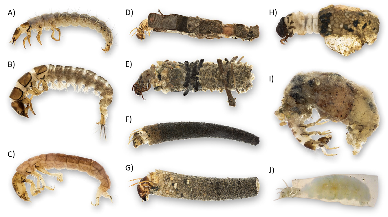 Os tricópteros dulçaquícolas podem ser encontrados preferencialmente em ribeiros de águas frescas e bem oxigenadas, onde se alimentam de uma grande variedade de recursos e ocupam diferentes micro-habitats. Por exemplo, muitas espécies alimentam-se de detritos vegetais grosseiros como folhas de origem terrestre (espécies fragmentadoras; TABELA 3). As espécies fragmentadoras que são ativas durante o dia (espécies diurnas) constroem casulos portáteis total ou parcialmente com elementos vegetais para se camuflarem entre os detritos vegetais onde habitam (p. ex., famílias Lepidostomatidae e Limnephilidae; FIGURAS 1 e 4). As espécies fragmentadoras que são ativas durante a noite (espécies noturnas) passam o dia parcialmente enterradas na areia e por isso os casulos portáteis são de areia para melhor camuflagem (p. ex., família Sericostomatidae; FIGURA 1).