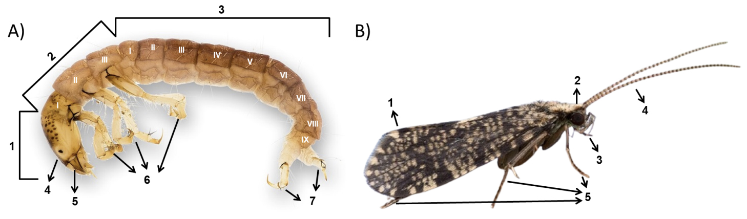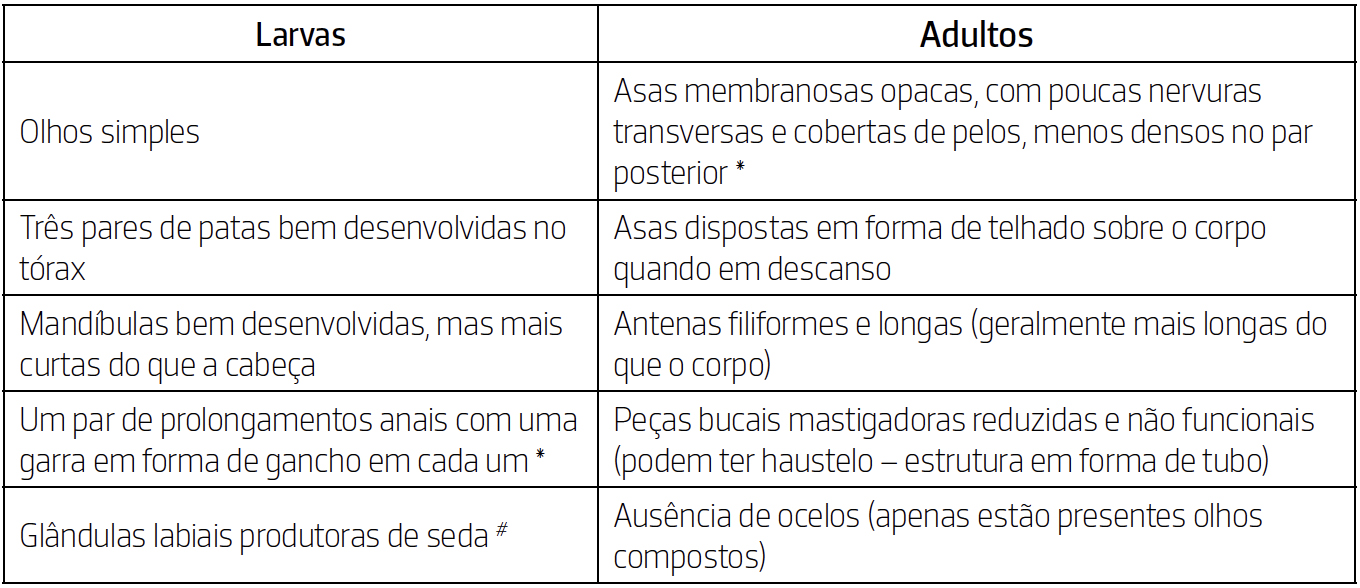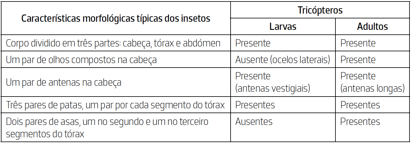 Os tricópteros têm larvas completamente distintas dos adultos (são insetos holometabólicos) (FIGURA 2), e por isso o conjunto das características típicas dos insetos está presente apenas nos adultos (TABELA 1).