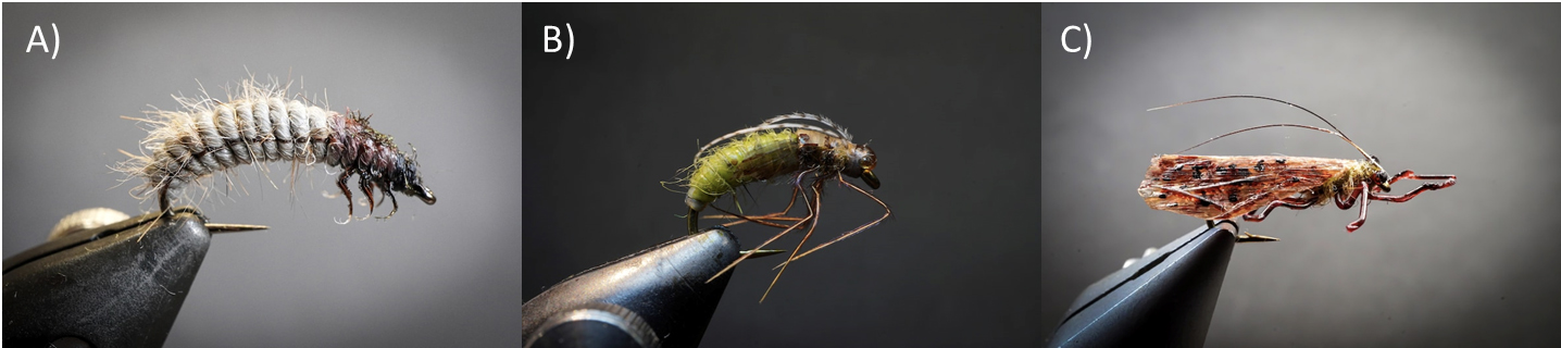 Isco na pesca com isco natural e inspiração de isco na pesca à mosca. As larvas de tricópteros são presas preferenciais de várias espécies piscícolas11 e por isso os pescadores usam-nas como isco na pesca com isco natural. Na técnica de pesca à mosca (“fly fishing”), é usado um isco artificial (“mosca” ou “fly”) que imita a presa natural da espécie de peixe alvo. Esta imitação é criada como parte integrante do anzol que lhe serve de base, usando linhas, penas, pelos e outros materiais leves de modo a produzir uma “mosca” que se assemelhe à presa da espécie de peixe alvo. A “mosca” pode representar qualquer fase do ciclo de vida do tricóptero sendo designada de “mosca molhada” (“wet fly”) quanto representa a larva ou o pré-adulto e de “mosca seca” (“dry fly”) quando representa o adulto. A “mosca” pode ser uma interpretação mais livre ou mais realista do inseto que se pretende imitar, e é em si uma obra de arte12 (FIGURA 6).