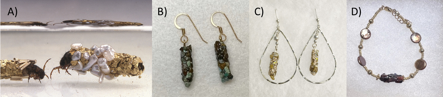 Arte e artesanato. A criação de casulos portáteis tubulares pelas larvas de algumas famílias de tricópteros tem sido explorada do ponto de vista artístico. O artista plástico francês Hubert Duprat trabalha com larvas de tricópteros (possivelmente da família Limnephilidae) desde a década de 1980, criando-as em aquários e fornecendo-lhes pepitas de ouro e pedras preciosas e semipreciosas em substituição dos elementos minerais que as larvas naturalmente usam para construírem os seus casulos (FIGURA 7). O artista depois exibe os casulos em exposições13. Ao longo das últimas décadas, Hubert Duprat compilou exaustivamente publicações e outros recursos sobre os tricópteros, que usou para o projeto “Miroir du Trichoptère”, que inclui um livro, uma exposição, e uma página online com a listagem completa dos mais de 1600 títulos que colecionou sobre o tema14. Outros artistas têm criado peças de bijuteria com casulos de tricópteros. A artista mais reconhecida neste campo é a americana Kathy Stout, que desde 1995 cria larvas de Pycnopsyche gentilis (família Limnephilidae) em aquários com pedras semipreciosas e depois usa os casulos que as pupas deixam quando passam à fase adulta para criar brincos, pendentes e pulseiras15 (FIGURA 7).