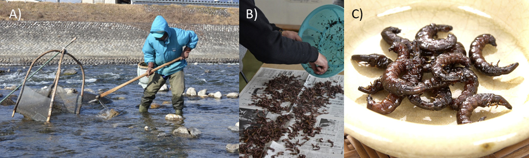 Iguaria. Na região de Nagano, Japão, as larvas de várias espécies de insetos aquáticos (“zazamushi”), principalmente larvas de Stenopsyche marmorata (família Stenopsychidae) que podem atingir 4,5 cm de comprimento, eram tradicionalmente usadas como fonte de proteína pelas comunidades locais16, 17. O hábito de consumir insetos aquáticos tem vindo a diminuir e atualmente “zazamushi” é considerado uma iguaria, vendida essencialmente como “souvenir”16, 17. A apanha de “zazamushi” (que requer licença se recorrer a rede) decorre entre dezembro e fevereiro, maioritariamente no rio Tenryῡ, onde as larvas habitam zonas de corrente rápida e chegam a atingir densidades de 2000 larvas por metro quadrado16, 17 (FIGURA 8). Depois de selecionadas as larvas a usar, estas são rapidamente fervidas em água para limpeza e depois são cozinhadas com molho de soja e açúcar17 (FIGURA 8).