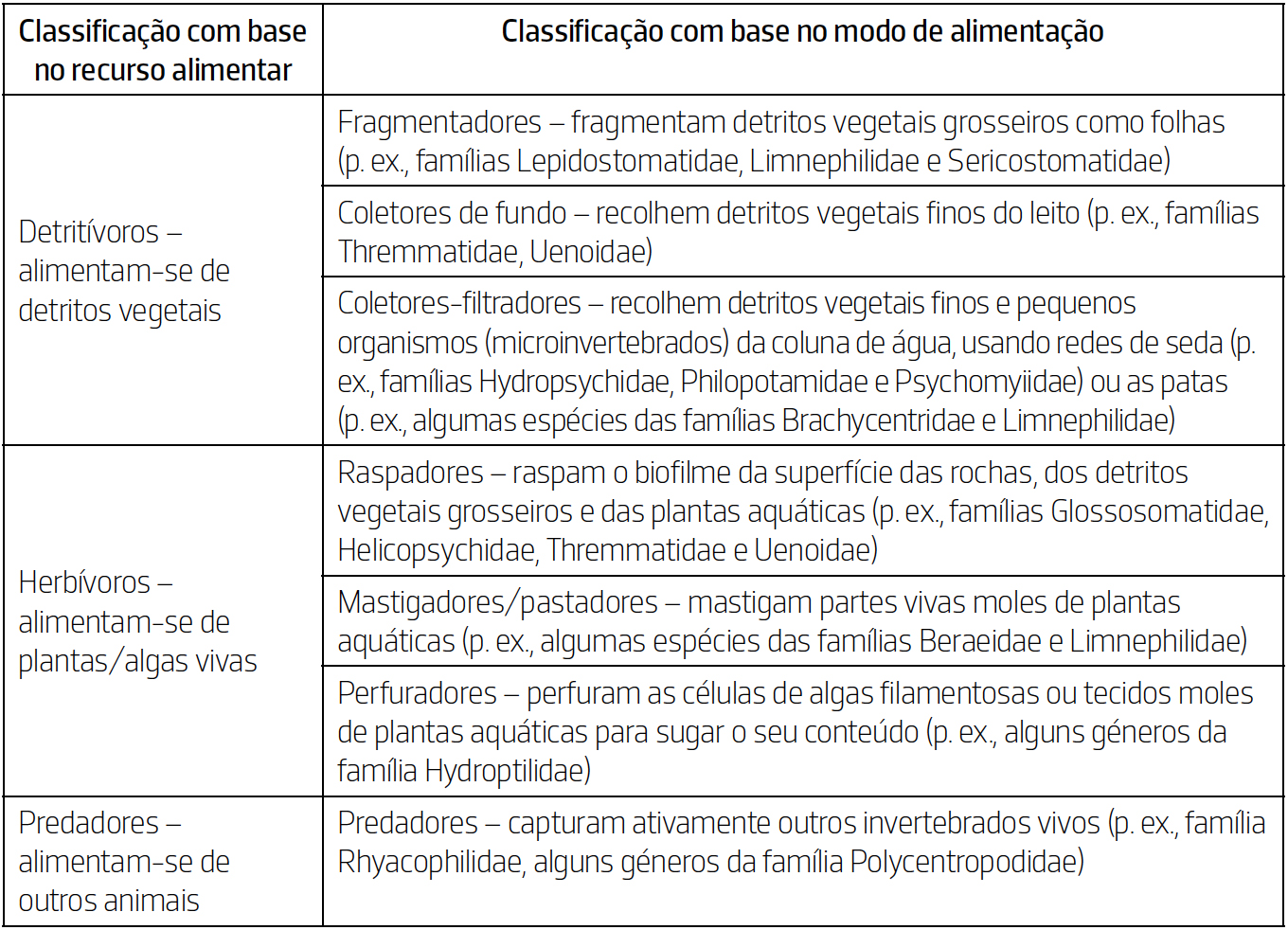 As espécies que se alimentam de biofilme, raspando a camada de algas microscópicas que se desenvolve na face superior das rochas (espécies raspadoras; TABELA 3), habitam áreas pedregosas e fazem casulos portáteis de areão ou pequenos cascalhos (p. ex., família Glossosomatidae; FIGURAS 1 e 4). As espécies tipicamente filtradoras (alimentam-se de partículas finas de detritos ou pequenos animais arrastados pela corrente; TABELA 3) habitam zonas com corrente relativamente rápida onde fazem redes relativamente planas com menos de 1 cm2 (p. ex., família Hydropsychidae) ou com corrente mais lenta onde fazem redes em forma de saco ou tubo (p. ex., famílias Philopotamidae e Polycentropodidae) (FIGURAS 1 e 4). Já as espécies que se alimentam de algas filamentosas e plantas aquáticas estão frequentemente associadas a estes elementos (p. ex., família Hydroptilidae; TABELA 3).