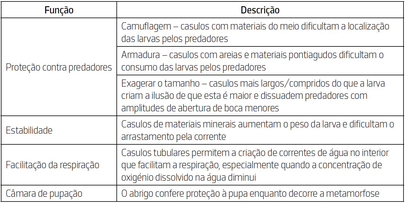 Os casulos portáteis construídos pela maioria das famílias de tricópteros têm várias funções (TABELA 4), e refletem a disponibilidade de materiais no meio.