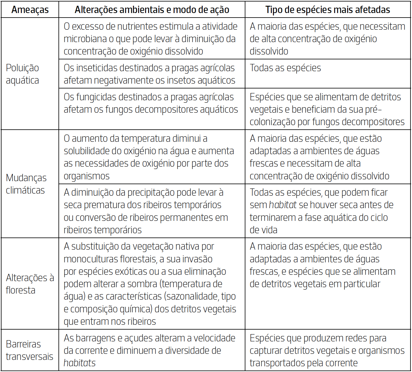 É necessário aumentar o conhecimento sobre os tricópteros a nível nacional para determinar o estatuto de conservação das espécies e, se necessário, implementar medidas de conservação. A preservação dos tricópteros está intimamente dependente da preservação dos rios. No entanto, dados recentes indicam que 45% dos rios em Portugal continental têm um estado ecológico inferior a Bom [percentagem essa que é de 51–63% nas regiões hidrográficas (RH) do rio Tejo e ribeiras do Oeste (RH5), dos rios Sado e Mira (RH6) e do rio Guadiana (RH7)]25, o que pode colocar em risco as populações destas espécies sensíveis (TABELA 5). Os tricópteros são parte integrante das comunidades aquáticas, desempenham funções ecológicas importantes e fornecem serviços que beneficiam as populações direta ou indiretamente, pelo que é necessária a preservação dos seus habitats.