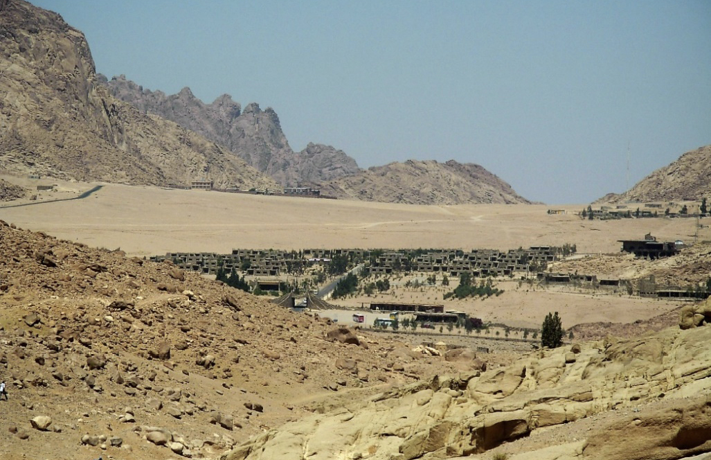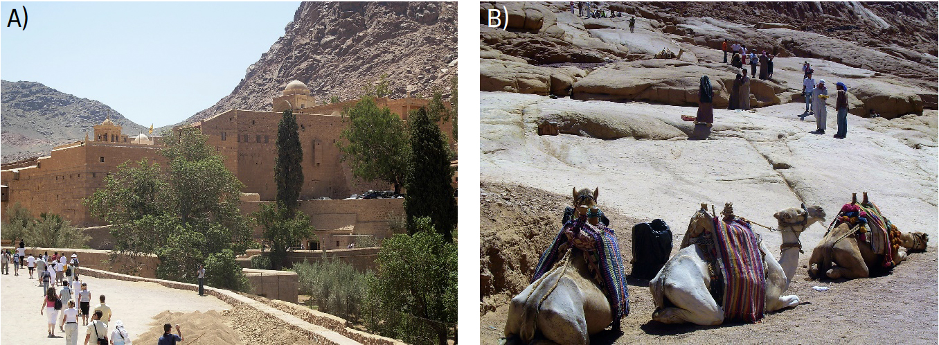 Canais de ligação entre o Mediterrâneo e o Índico. Estamos no bordo oriental da placa litosférica Núbia (ou Africana), não muito longe da zona de divergência desta com a placa Arábica. As paisagens, despidas de vegetação, que caracterizam toda a porção meridional da Península do Sinai, denotam que estamos num ambiente claramente desértico. As mesmas franjas de latitude de lugares já visitados, como a vizinha Jordânia1, ou a Namíbia2, onde os efeitos conjugados da circulação atmosférica com as correntes oceânicas, são responsáveis pela muito baixa pluviosidade destas regiões do planeta. Como tal, sem grande resquício de flora a atrapalhar as observações, as rochas emergem da superfície do solo, mostrando facilmente as suas geometrias, cores e texturas. Sejam elas rochas sedimentares, metamórficas ou magmáticas, localmente cobertas por areias transportadas pela ação eólica (FIGURA 3). No Monte Sinai, tão retratado no Antigo Testamento, e onde nos vem imediatamente à memória o não menos bíblico Dez Mandamentos, já referenciado na memorável volta à Jordânia1, despontam morfologias de contornos bastante irregulares. Está visto, e pela própria cor, que se tratam de rochas plutónicas ácidas, tal como as da cidade do Rio de Janeiro3. Na envolvência do curioso Mosteiro ortodoxo de Santa Catarina, lugar de introspeção e de peregrinação turística, localizado no sopé do Monte Sinai (FIGURA 4 A)), são evidentes os tradicionais blocos de granito, tipologia pouco dada à inclusão de minerais máficos, o que confere uma cor mais clara à rocha, amplificada pela forte ambiência árida (FIGURA 4 B)).