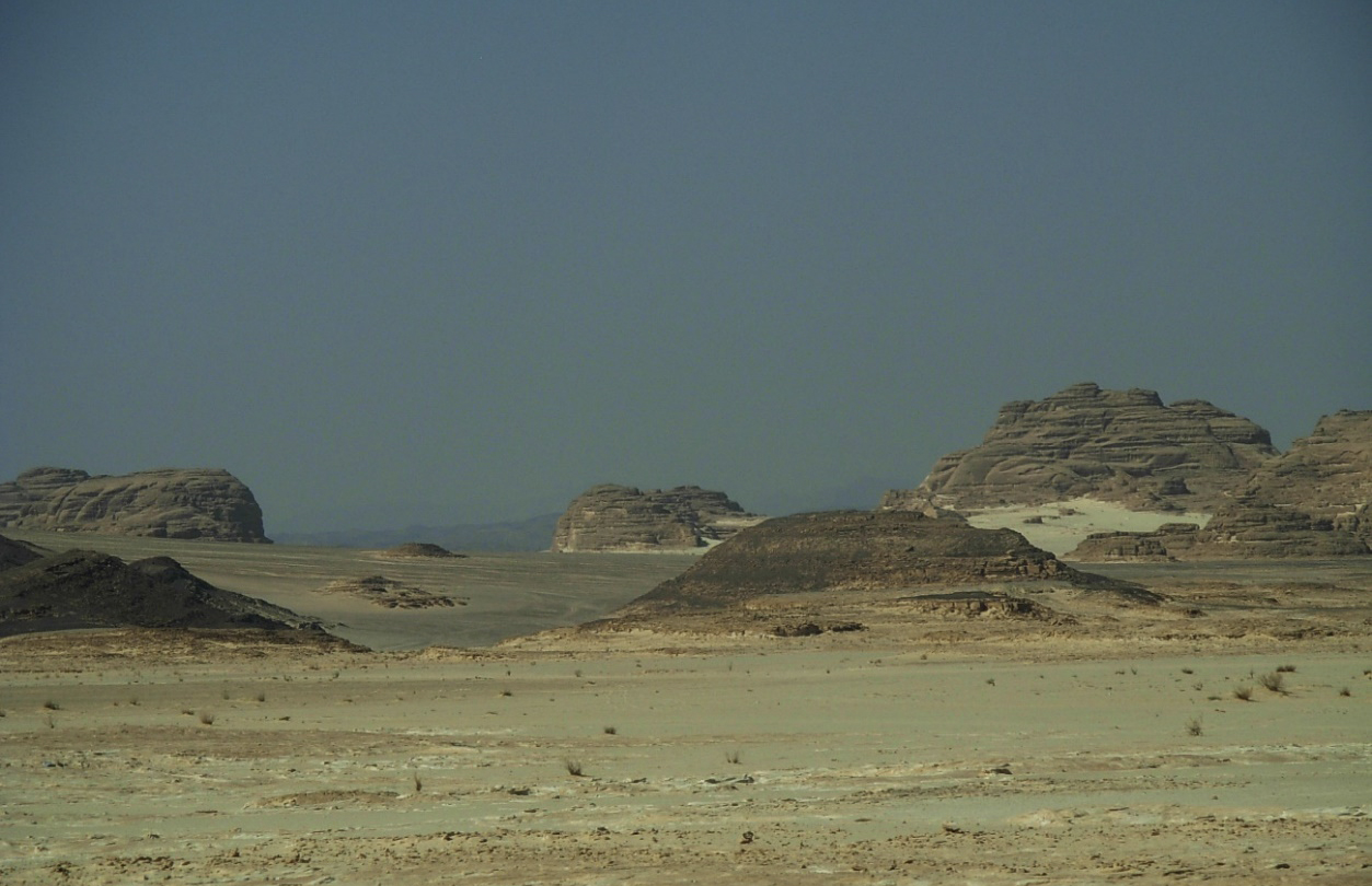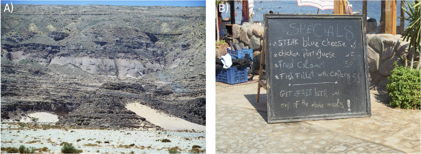 Mas, na estrada que nos fez chegar ao coração do Sinai e que nos leva de volta a Dahab, no Golfo de Aqaba, sobressaem na paisagem muitos outros tipos de morfologias e, consequentemente, de rochas. A estratificação que se observa à distância não engana quanto ao facto de serem litologias sedimentares, normalmente de idade cretácica e cenozoica, de origem continental ou marinha7. Entre corpos sedimentares isolados, tipo inselbergs, completamente erodidos, a lembrar muitas outras paragens de ambientes desérticos (FIGURA 5), a sucessões sedimentares mais completas e diversificadas (FIGURA 6 A)).