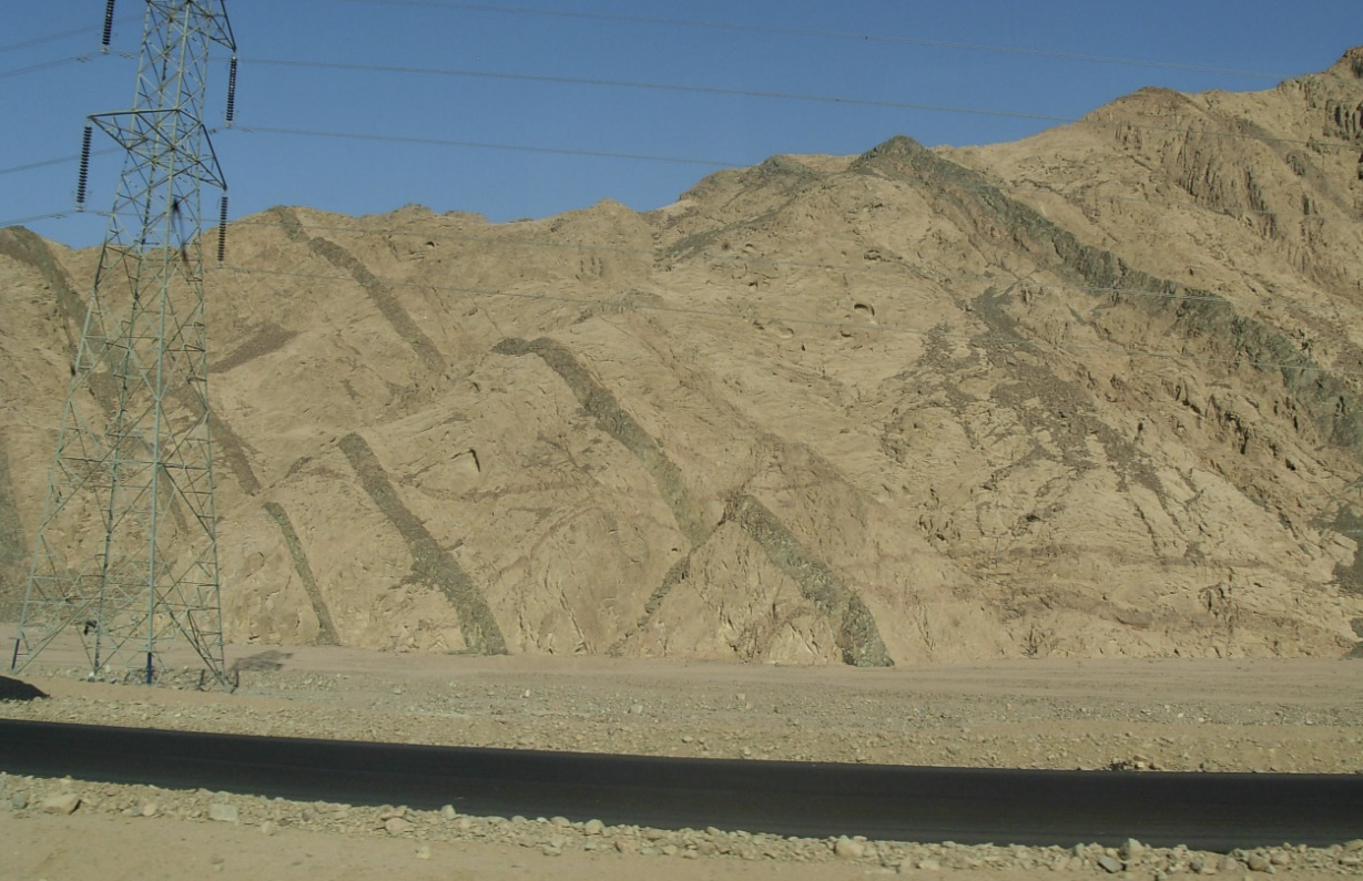 À semelhança da chegada a Aqaba, para quem vem de Wadi Rum1, os granitoides estão intensamente recortados por filões de rocha básica, mais certinhos em termos de atitude, e de outros diques de rocha mais clara (FIGURA 7). Não é possível negar a magnitude deste registo, que se destaca a vários quilómetros de altitude, facilmente discerníveis para quem sobrevoe esta parte do planeta.