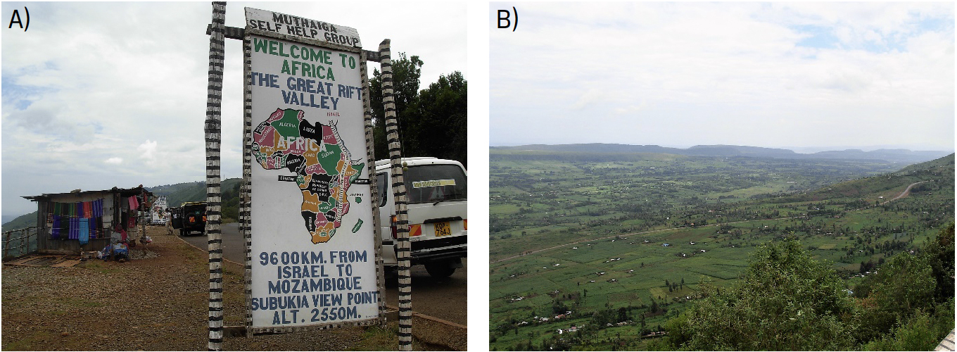 É à boleia destes conceitos, do revisitado Ciclo de Wilson11, que nos deslocamos para sul, para Nairobi, onde aterrámos três anos depois do pequeno périplo pelo Sinai. Relativamente ao Quénia, facilmente encontramos uma motivação adicional para a viagem. O filme África Minha, de 1985, que reúne dois “pesos pesados” da arte da representação, para além do não menos conceituado realizador, Sydney Pollack, de tantas outras magníficas produções cinematográficas. A passagem pela capital do Quénia é sumária, mas dá logo para sentir a ambiência de grande parte do país, já que Nairobi está a mais de 1600 metros de altitude e a cerca de 1˚ de latitude sul. Há que ganhar tempo para o programa ambicioso que se avizinha. Desta vez, como principal objetivo, o de observar os big five em seu espaço natural, a savana. E, já agora, todos os outros mamíferos selvagens a que se tem direito. No caso da geologia, será mais fácil imaginá-la do que vê-la pois, contrariamente ao Sinai, a vegetação é algo que não falta na paisagem, que tem a particularidade de esconder grande parte dos maciços rochosos. São três os parques nacionais selecionados nesta incursão: Aberdare, Lago Nakuru12 e, o mais famoso de todos, Masai Mara, onde foi rodado parte de África Minha. Tal como Nairobi, todos eles a grande altitude e envolvidos por antigos aparelhos vulcânicos, ocultos pela vegetação. Em Aberdare, rodeado de montanhas bem altas, desenvolve-se o espaço mais húmido dos três parques13, tendo como principal atrativo a observação noturna da vida animal (FIGURA 9 A)).