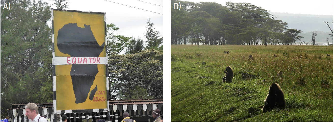 Deixamos para o fim o Lago Nakuru, em pleno Vale do Rifte. Logo depois de termos atravessado a linha imaginária do equador (FIGURA 11 A)), e sido presenteados com uma demonstração dita científica, espécie de magia da física, do Efeito de Coriolis. Como se a linha equatorial fosse algo de milimétrica. Espantosa demonstração, e com direito a certificado! Na entrada do Parque de Nakuru, assim como em parte dos caminhos percorridos, a presença de matilhas de babuínos, como se estivessem numa missão de vigilia e de policiamento dos humanos, que por ali iam passando (FIGURA 11 B)).