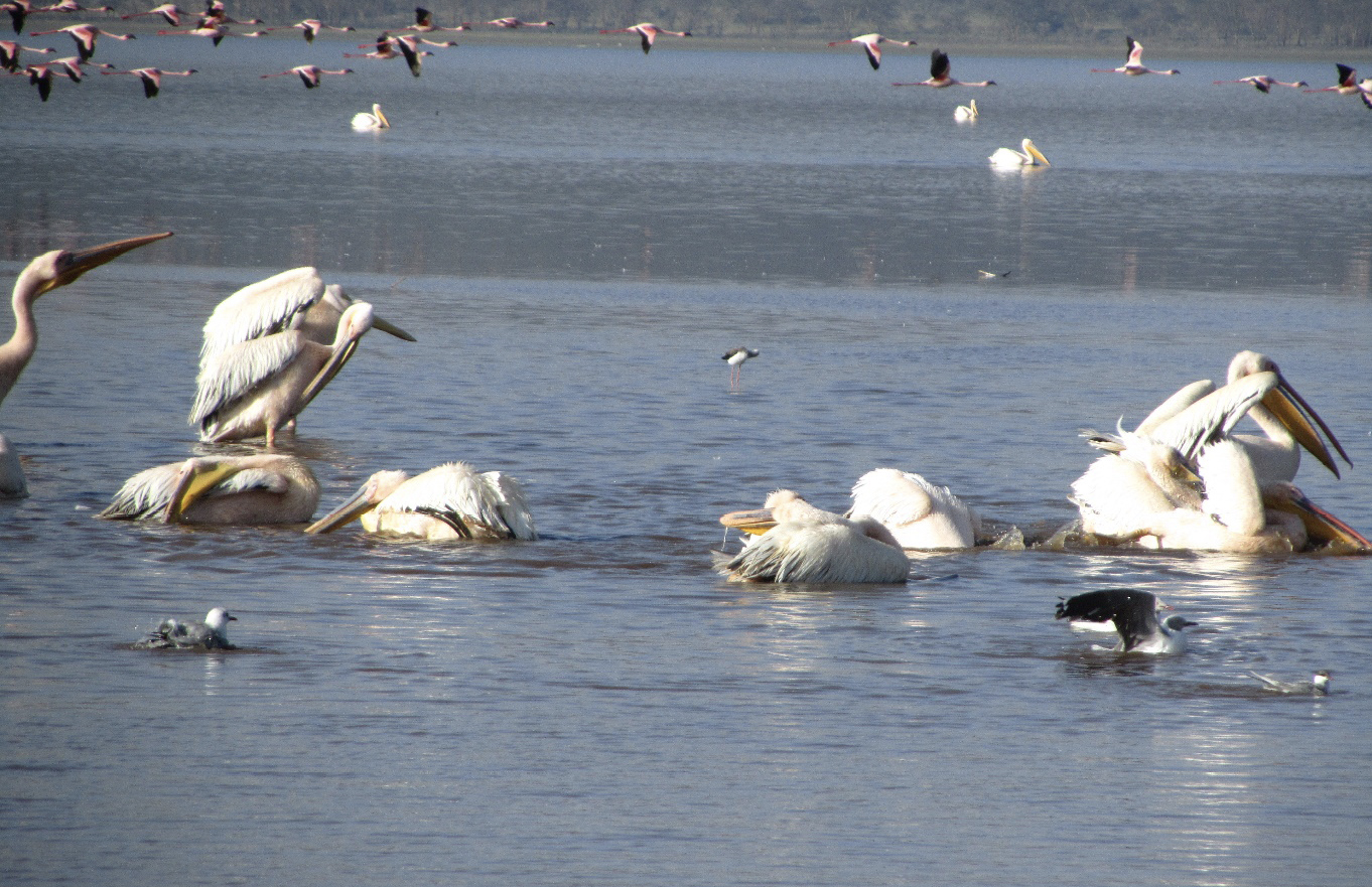A fauna de vertebrados não é assim tão diferente de Masai Mara. Mas a presença do lago cria apetência para outros habitantes, como os flamingos e os pelicanos (FIGURA 12), colónias de aves aquáticas já avistadas em Walvis Bay, no outro lado de África2.